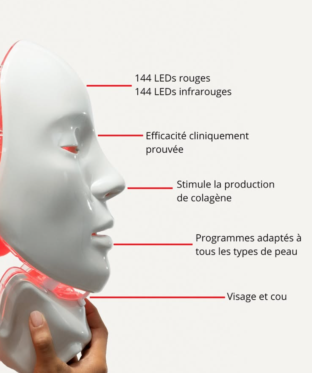 - La chaleur légère diffusée par les LED détend les muscles du visage, relâche les mâchoires, réduit les tensions accumulées et favorise une sensation globale de bien-être.